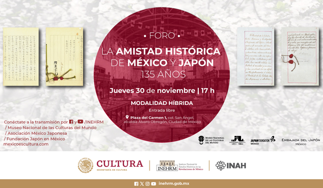 CDMX.- Para conmemorar la firma del “Tratado de amistad, comercio y navegación entre México y Japón”, la Secretaría de Cultura del Gobierno de México, a través del Instituto Nacional de Estudios Históricos de las Revoluciones de México (Inehrm), invita al foro: “La amistad histórica de México y Japón. 135 años», el jueves 30 de noviembre, a las 17:00 horas.