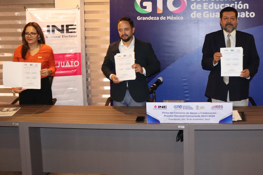 Guanajuato, Gto. El Instituto Nacional Electoral (INE) en el Estado de Guanajuato y el Instituto Electoral del Estado de Guanajuato (IEEG) firman convenio de apoyo y colaboración con la Secretaría de Educación de Guanajuato (SEG) para establecer las bases y mecanismos de coordinación y cooperación, con motivo del Proceso Electoral Concurrente 2023-2024.