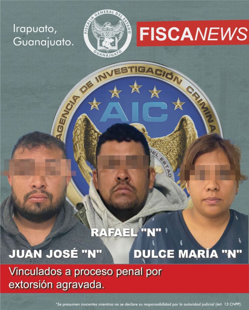 Irapuato, Gto. La Unidad de Combate a la Extorsión de la Fiscalía Especializada en Investigación de Delitos de Alto Impacto (FEDAI), desplegó acciones para la captura de dos hombres y una mujer que presuntamente extorsionaron a un transportista en la ciudad de Abasolo.