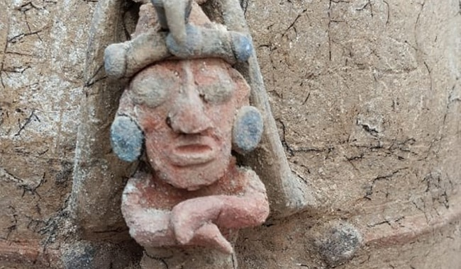 CDMX.- Como parte de las labores de salvamento arqueológico que realiza la Secretaría de Cultura del Gobierno de México, a través del Instituto Nacional de Antropología e Historia (INAH), en las obras del Tramo 7 del Tren Maya, especialistas localizaron una urna funeraria con la representación del dios del maíz.