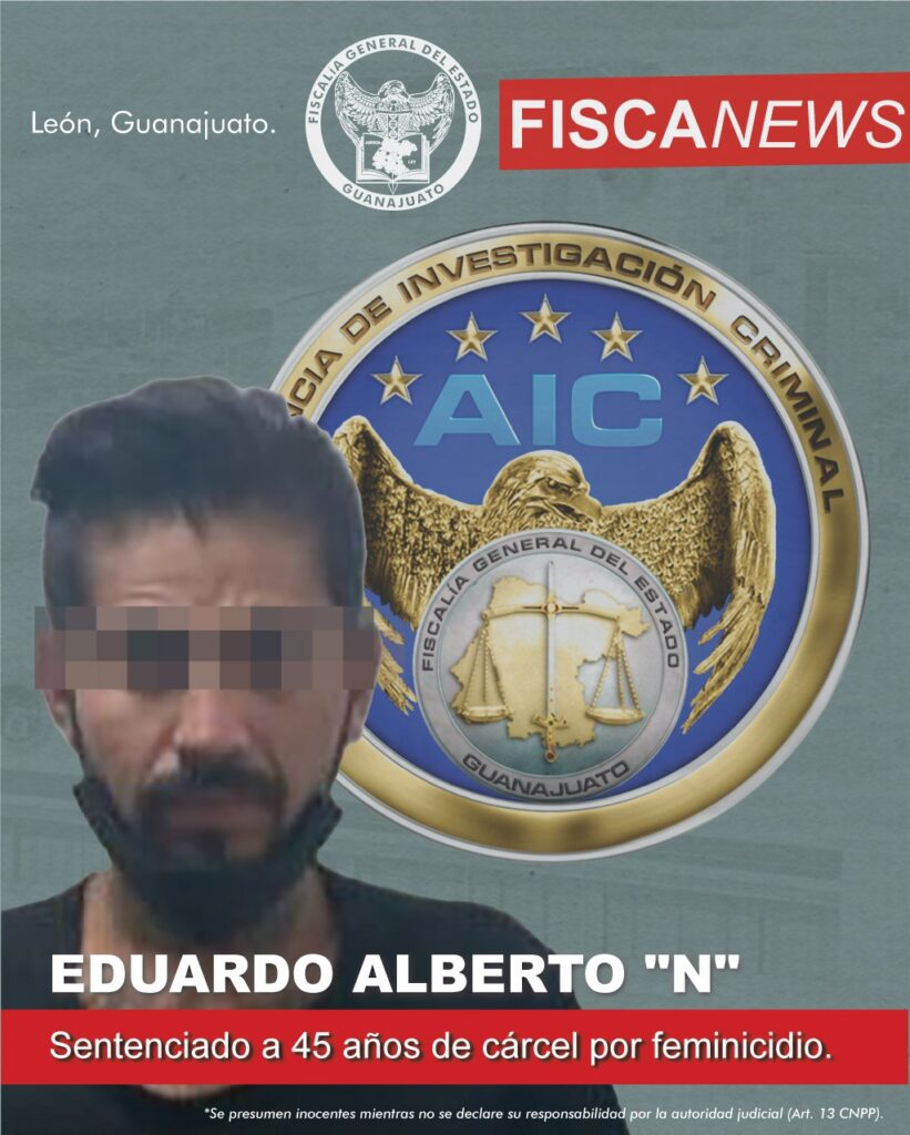 León, Gto. Las pruebas presentadas en juicio oral, fueron determinantes para que la Fiscalía de Guanajuato obtuviera una sentencia de 45 años de cárcel para el feminicida EDUARDO ALBERTO “N”. Este sujeto privó de la vida a su pareja Ma. de Jesús “N”, en la colonia Brisas del Campestre, en marzo de 2022.