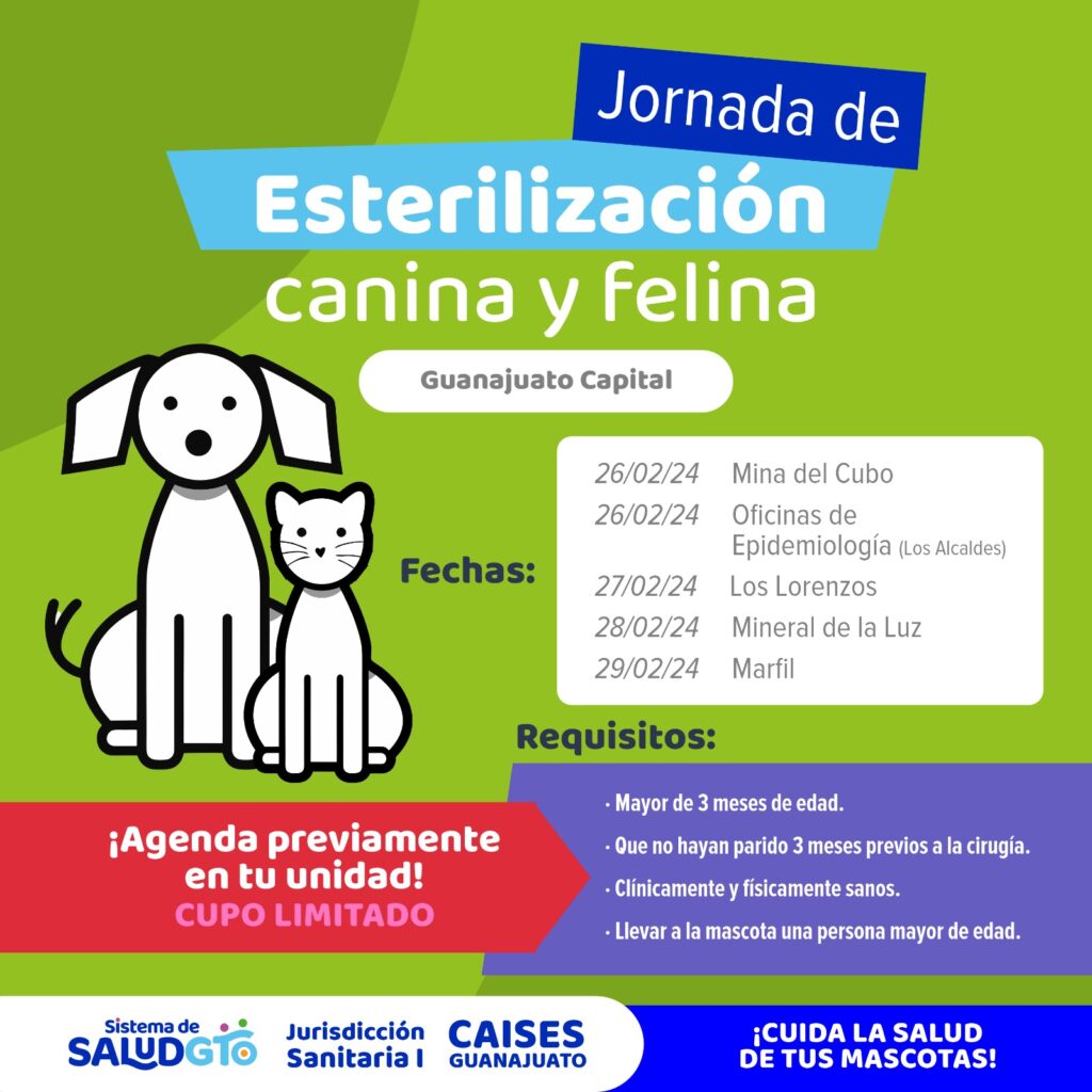 Guanajuato, Gto. En la búsqueda constante de promover la salud y el bienestar de las mascotas, la Secretaría de Salud de Guanajuato a través de la Jurisdicción Sanitaria I (JSI) de Guanajuato capital realizará una Jornada de esterilización canina y felina durante el mes de febrero en los cinco municipios de la zona.
