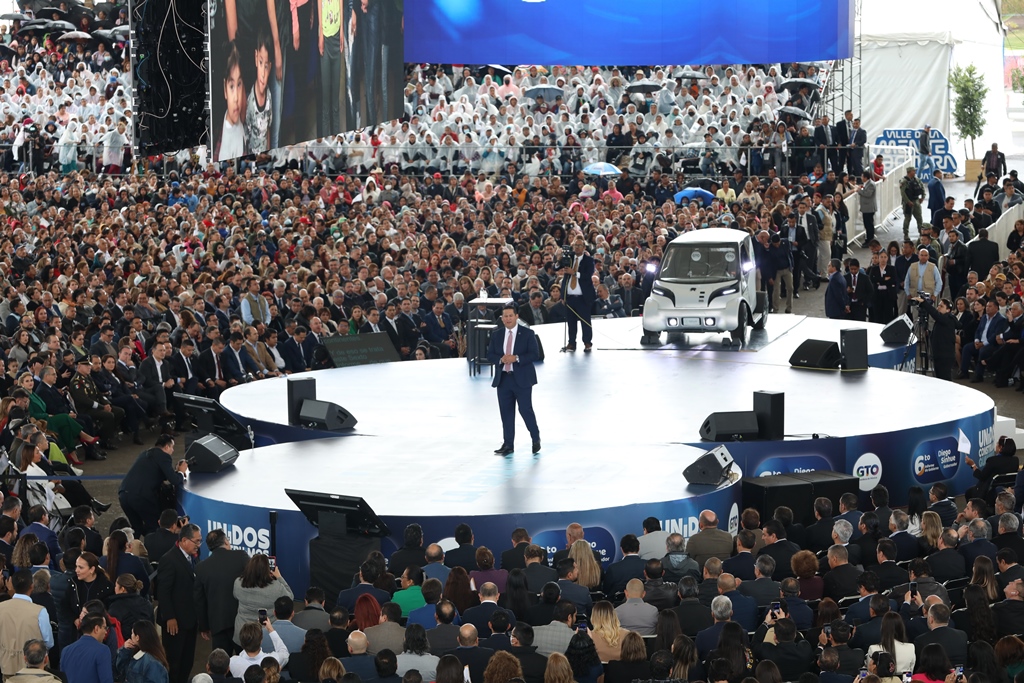 La entrada del mandatario fue a bordo del primer automóvil eléctrico fabricado totalmente por jóvenes guanajuatenses, un modelo subcompacto en el que subió hasta el escenario.