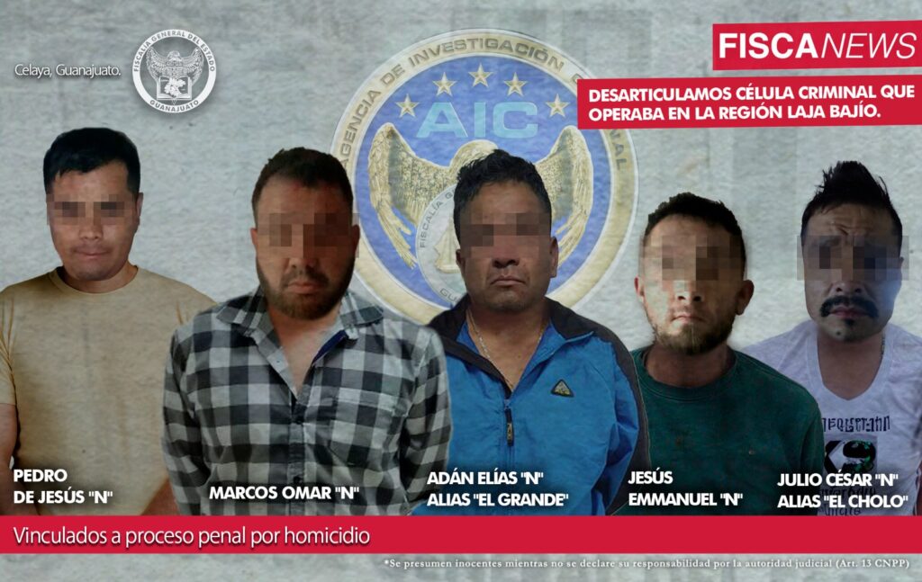 Los detenidos son: ADÁN ELÍAS “N”, de 47 años, alias “El Grande”; JULIO CÉSAR “N”, de 38 años, alias “El Cholo”; MARCOS OMAR “N”, de 27 años; JESÚS EMMANUEL “N”, de 24 años y PEDRO DE JESÚS “N”, de 23 años; fueron identificados, ubicados y capturados por Agentes de Investigación Criminal.