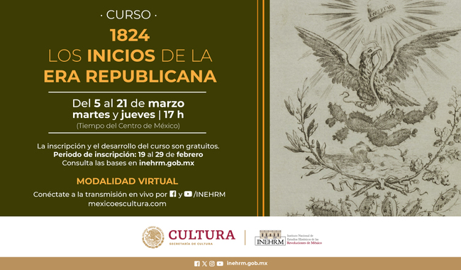 Para las personas interesadas en obtener una constancia de participación en el curso, las inscripciones estarán abiertas a partir de hoy, 19 febrero de 2024, y hasta el 29 de febrero próximo, en: https://inehrm.gob.mx/es/inehrm/1824_Los_inicios_de_la_era_Republicana.