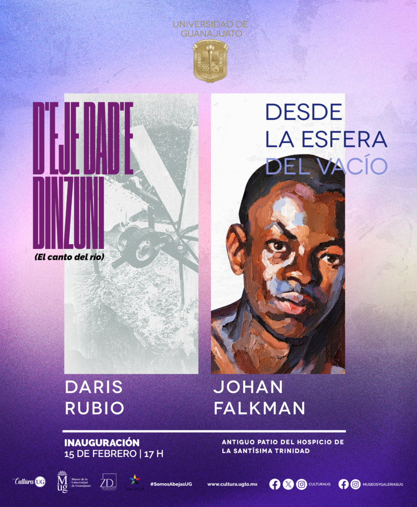 De acuerdo al comunicado de prensa, la temporada contempla dos exposiciones, “D’eje dad’e dinzuni (El canto del río)”, conformada por obras de Daris Rubio, artista hñähñu originaria de Hidalgo, en la Galería Temporal del Museo de la Universidad de Guanajuato; y “Desde la esfera del vacío”, del reconocido artista sueco Johan Falkman, instalada Galerías Polivalente, Hermenegildo Bustos y Corredor Tomás Chávez Morado.