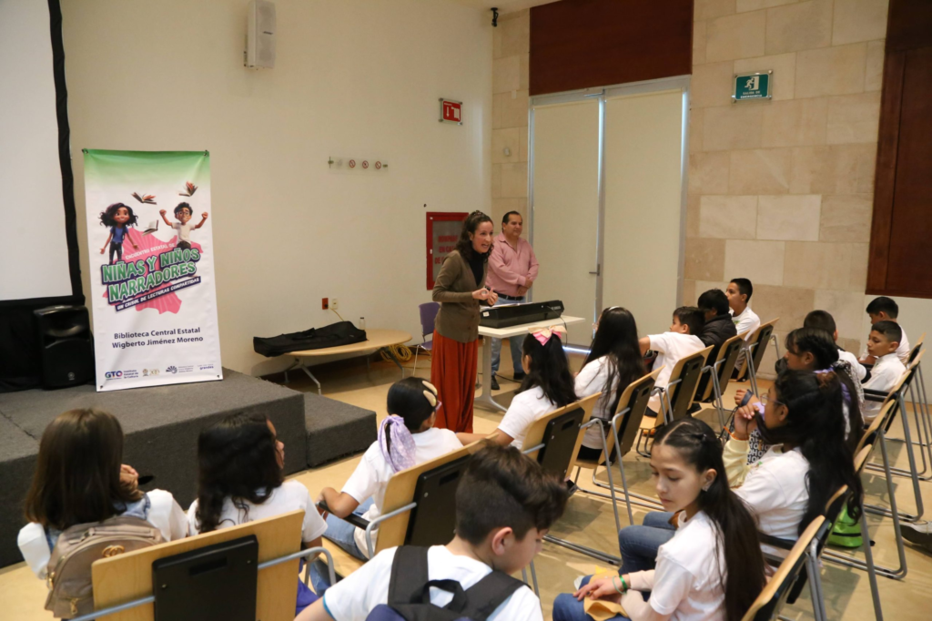 León, Gto.- Con la participación de un centenar de niñas y niños de las bibliotecas públicas de los municipios de Acámbaro, León, San Francisco del Rincón y Pénjamo se realizó el Encuentro Estatal de Niñas y Niños Narradores en la Biblioteca Central Estatal Wigberto Jiménez Moreno.