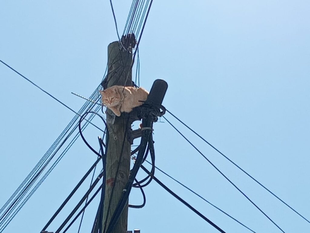 Guanajuato, Gto. La Policía Ambiental de Guanajuato y el cuerpo de Bomberos SIMUB rescataron a un gatito que estaba en lo alto de un poste, atrapado entre el cableado.