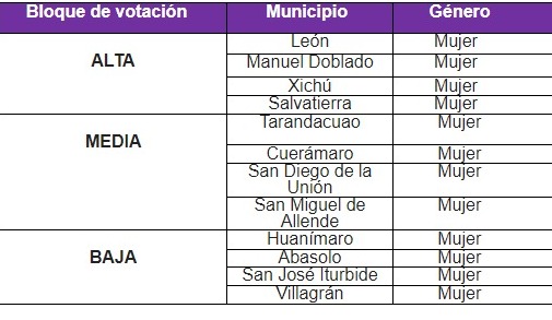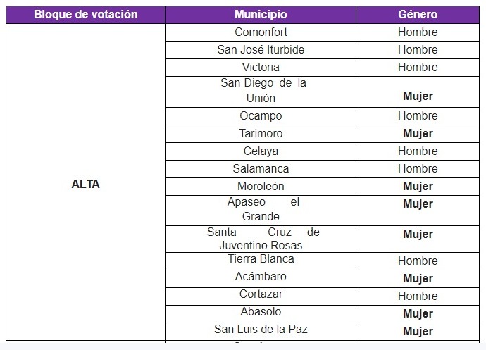 Una vez realizado el análisis correspondiente se consideró procedente la propuesta de bloques con que el Partido Acción Nacional contenderá en lo individual en 24 municipios, pues en el bloque de municipios de alto porcentaje de votación, se postularán cuatro mujeres y cuatro hombres; en el bloque de votación media, cuatro mujeres y cuatro hombres; y en el bloque de votación baja, cuatro mujeres y cuatro hombres.