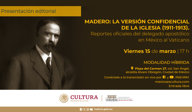 CDMX.- La Secretaría de Cultura federal, a través Instituto Nacional de Estudios Históricos de las Revoluciones de México (Inehrm), invita a la presentación del libro Madero: la versión confidencial de la Iglesia (1911-1913). Reportes oficiales del delegado apostólico en México al Vaticano, de Guillermo Dellamary Toral, en el marco de la divulgación de nuevos hallazgos cuya contribución enriquece la historiografía sobre el tema.