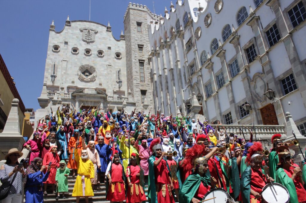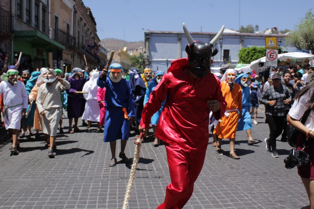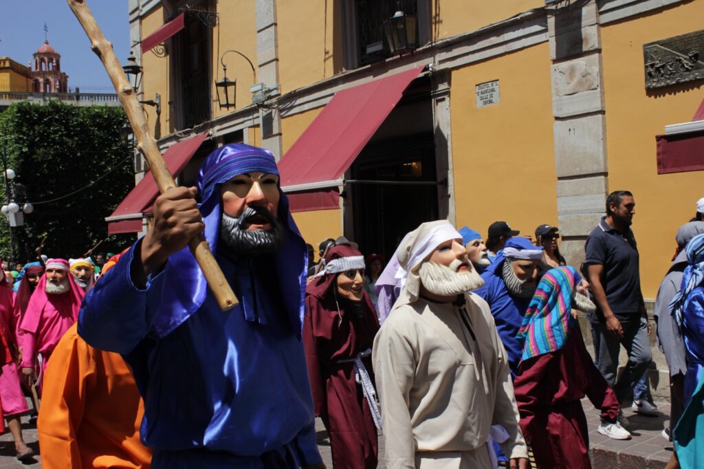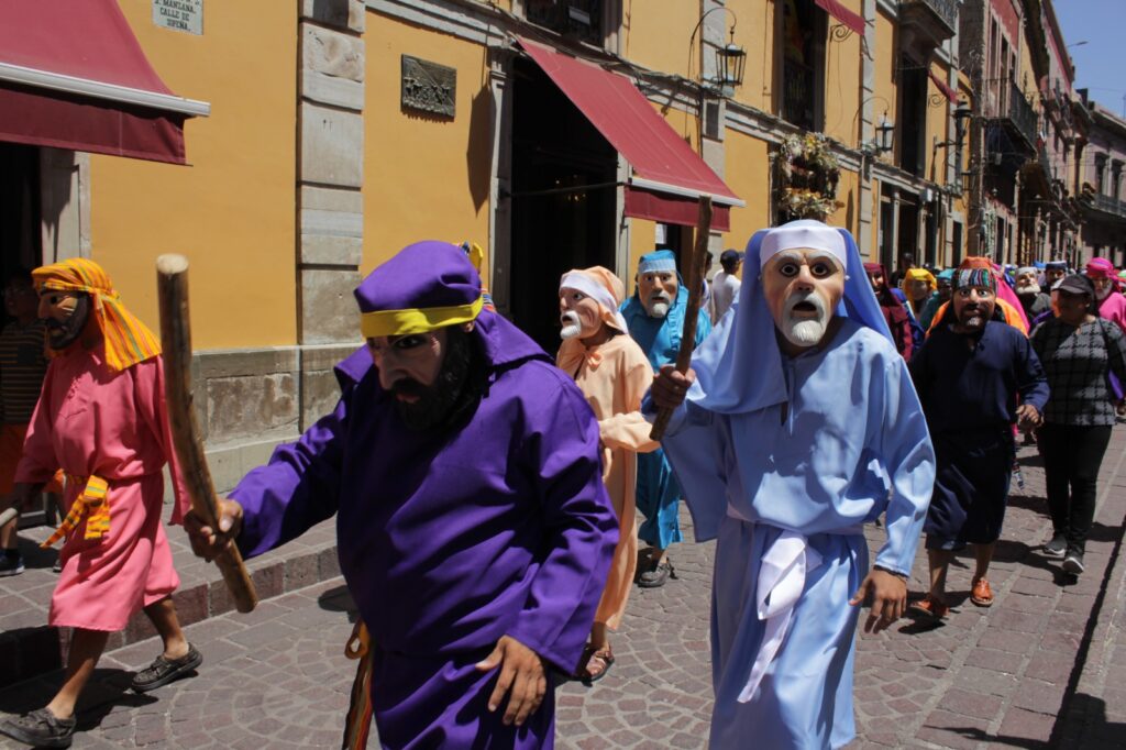 Más de 300 judíos en escena y más de 300 máscaras hechas con colorín llegaron desde la tierra del pintor Hermenegildo Bustos (1832-1907) para pintar a la capital cultural del estado con el púrpura, el tono rojizo y el brillo azul de las vestimentas que evocaron los pasajes de la Pasión de Jesús, desde su aprehensión hasta el juicio que los fariseos propiciaron con falsas acusaciones, hechos basados en los evangelios canónicos de la tradición católica, excepto el caso de Judas que, en esta representación, es perseguido y llevado al patíbulo por la legión judía, contrario a las lecturas evangélicas.