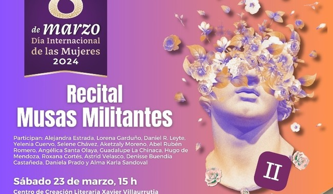 De acurdo al comunicado de prensa, mediante el Centro de Creación Literaria Xavier Villaurrutia (CCLXV), la CNL llevará a cabo el Recital Musas Militantes Parte II, dedicado a la labor de mujeres contemporáneas desde una perspectiva de género, en la cual participarán las autoras Queta Navagómez, Marcela Romn, Joel G. Rodríguez Toral, María Cruz, Iván Cruz, Carolina Alvarado, Ricardo Arenas y Alma Karla Sandoval, el viernes 22 a las 19:00 hrs.