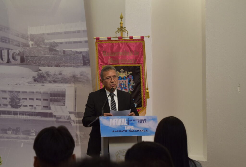 Guanajuato, Gto.- Los frutos del trabajo conjunto de la comunidad del Campus – Salamanca, se mostraron en el Informe Anual de Actividades del ejercicio 2023, que presentó el Dr. Armando Gallegos Muñoz, Rector del Campus, en representación de la comunidad universitaria que colabora en las sedes Irapuato, Salamanca, Yuriria y Tierra Blanca de la Universidad de Guanajuato.