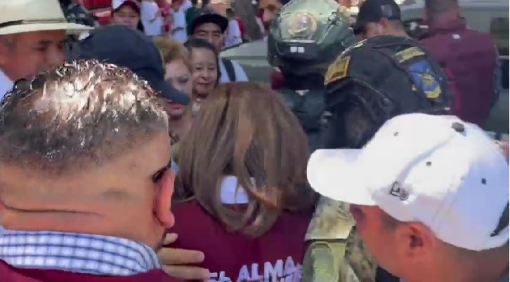 Efectivos de la Guardia Nacional y el Ejercito mexicano, se interpusieron para evitar que la prensa se acercara a la candidata, incluso se empujó a uno de los compañeros, para que dejara de tomar fotos, al cerrar la camioneta de la candidata.