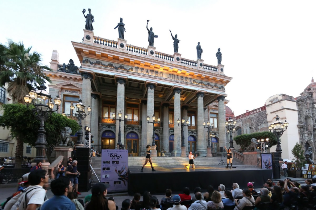 Guanajuato, Gto.- Un festivo abanico de ritmos, pasos y figuras se desplegó este lunes en las escalinatas del Teatro Juárez, en la muestra Danza Guanajuato, con la que media docena de agrupaciones se unieron a la celebración del Día Internacional de la Danza.