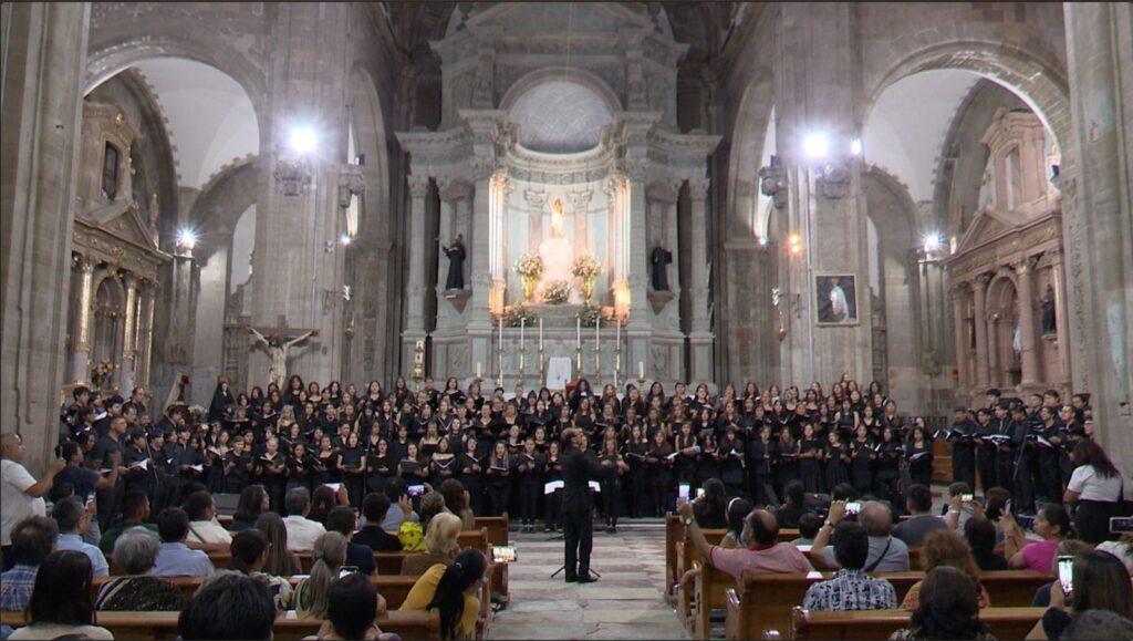 Guanajuato, Gto.- Entre comunidad universitaria, público local, visitantes extranjeros, familias y asistentes frecuentes, el Templo de la Compañía de Jesús acogió el pasado martes 23 de febrero al Coro Monumental, integrado por 216 cantantes provenientes del Coro de la Universidad de Guanajuato (UG), los Coros Polifónicos de las Escuelas de Nivel Medio Superior de León e Irapuato, y el Coro Polifónico Mahler, del Conservatorio Mahler de Irapuato.