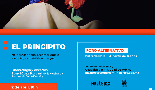 El martes 2 de abril no viene a mal recordar que “lo esencial, es visible a los ojos”, a través de la obra El Principito, con adaptación de Susy López P, a partir de la versión de Antoine de Saint-Exupéry, la cual tendrá función en el Foro Alternativo del Centro Cultural Helénico, el próximo martes a las 18:00 h, con entrada libre, como parte de Martes de títeres y objetos. Cupo limitado a 60 personas. Accesos al público en la taquilla, a partir de las 17:30 horas.