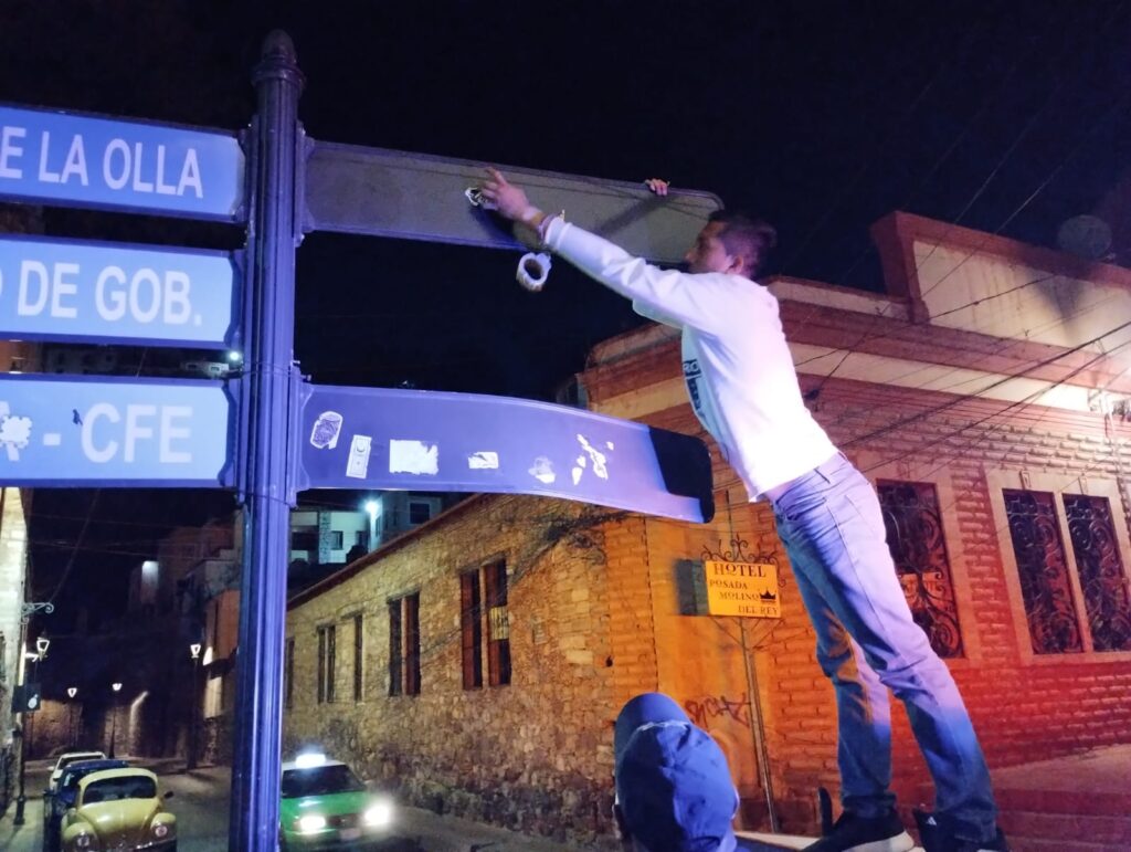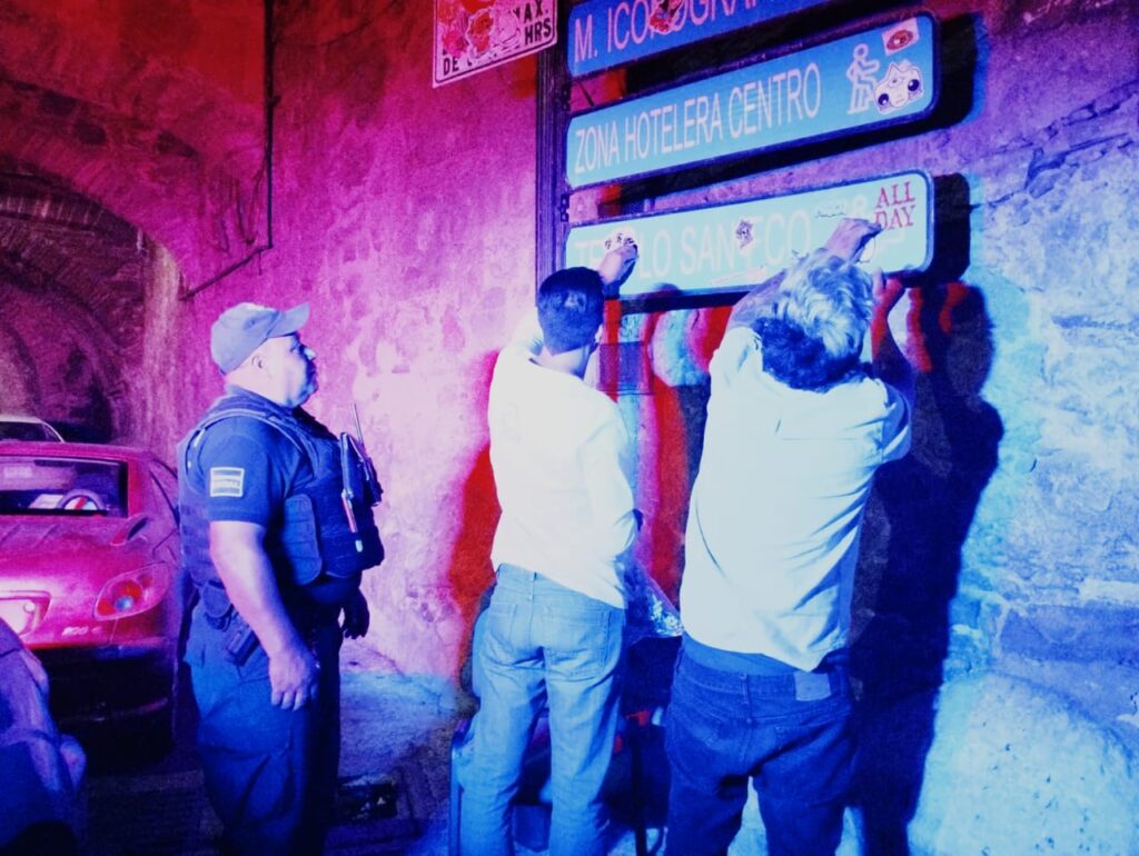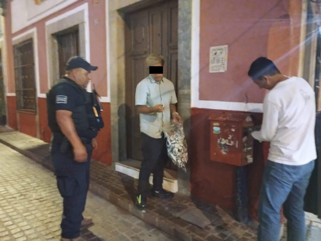 Guanajuato, Gto. La Policía Municipal de Guanajuato Capital detuvo a cuatro queretanos por pegar calcomanías sobre mobiliario urbano del centro histórico.