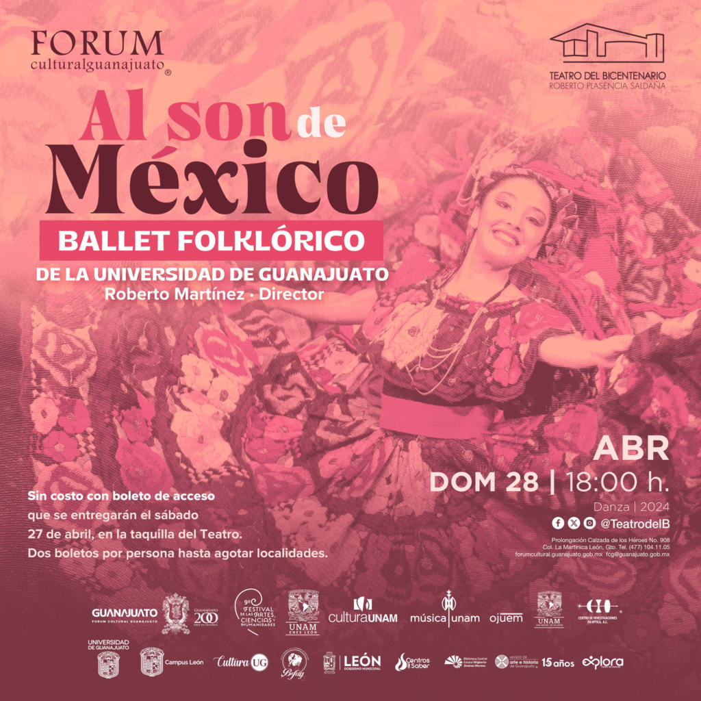 - Bajo la dirección del Mtro. Roberto Martínez Rocha, el BAFUG presenta “Al Son de México”, un programa que rinde homenaje a las diversas expresiones culturales y tradiciones del país a través de la danza folklórica.