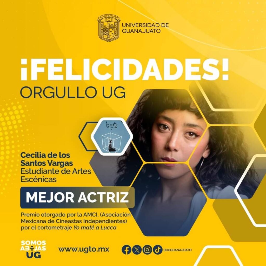 Guanajuato, Gto.- Como una de las protagonistas del cortometraje “Yo maté a Lucca”, Cecilia de los Santos Vargas, estudiante de la Licenciatura en Artes Escénicas de la División de Arquitectura, Arte y Diseño del Campus Guanajuato (DAAD-UG), fue galardonada con el premio a Mejor Actriz por parte de la Asociación Mexicana de Cineastas Independientes (AMCI).