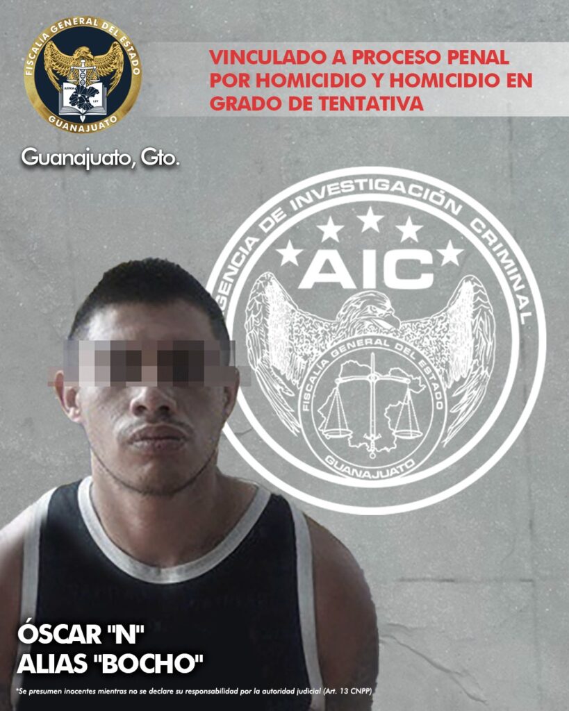 Guanajuato, Gto. La Fiscalía de Guanajuato esclareció el homicidio de Alexis Saúl “N”, también conocido como “El Chevez”, asesinado en el exterior de un auto lavado en la colonia Pueblito de Rocha. El presunto culpable ha sido vinculado a proceso penal por el delito de homicidio y homicidio calificado en grado de tentativa, en agravio de una víctima más.