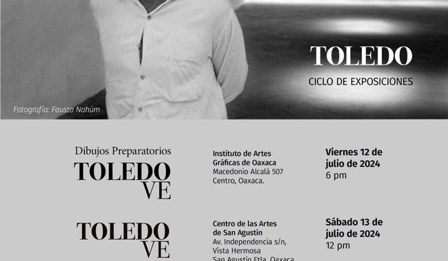 De acuerdo al comunicado de prensa, en el marco del 84 aniversario del natalicio del gran artistita juchiteco se inaugurará Dibujos preparatorios, Toledo Ve, este viernes 12 de julio. Esta muestra presenta bocetos inéditos que fueron fundamentales para la creación de obras que serán exhibidas posteriormente en el Centro de las Artes de San Agustín (CaSa). Dichas piezas provienen del acervo de la asociación civil Amigos del IAGO y del Centro Fotográfico Manuel Álvarez Bravo (Cfmab).