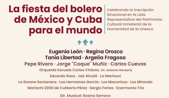 Para conmemorar este esfuerzo, la Secretaría de Cultura federal presenta el concierto La fiesta del Bolero, de México y Cuba para el mundo, un espectáculo que reúne diferentes exponentes mexicanos y cubanos, quienes darán voz a una serie de canciones que se han convertido en clásicos indiscutibles del género.
