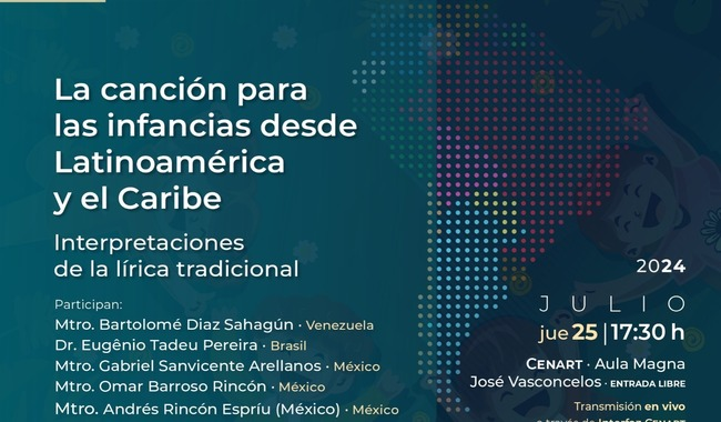 CDMX.- El Instituto Nacional de Bellas Artes y Literatura (Inbal) y la Subdirección General de Educación e Investigación Artísticas (Sgeia), a través del Centro Nacional de Investigación, Documentación e Información Musical “Carlos Chávez” (Cenidim), invitan al encuentro La canción para las infancias desde Latinoamérica y el Caribe. Interpretaciones de la lírica tradicional, que se realizará el 25 de julio, en el Aula Magna José Vasconcelos, ubicada en el Centro Nacional de las Artes.