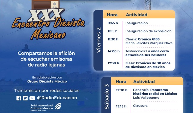 CDMX.- En el marco de su centenario, Radio Educación, institución de la Secretaría de Cultura del Gobierno de México, será sede del XXX Encuentro Diexista Mexicano, evento que congrega a radioaficionados, oyentes, asociaciones, grupos y clubes, quienes compartirán consejos, ideas, experiencias y técnicas en torno a esta práctica que involucra la transmisión-recepción de señales de Onda Corta.