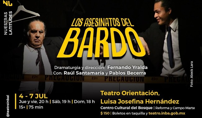 En comunicado de prensa se informó que la Secretaría de Cultura del Gobierno de México y el Instituto Nacional de Bellas Artes y Literatura (Inbal), a través de la Coordinación Nacional de Teatro y el Ensamble Labesc, presentan Los asesinatos del Bardo, con dramaturgia y dirección de Fernando Yralda y las actuaciones de Raúl Santamaría y Pablos Becerra.