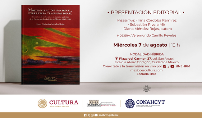 CDMX.- En el marco de la divulgación de nuevos hallazgos en la historiografía de los problemas agrarios de México, el Instituto Nacional de Estudios Históricos de las Revoluciones de México (Inehrm), institución de la Secretaría de Cultura del Gobierno de México, presentará el libro Modernización nacional, experticia transnacional. Itinerarios de los becarios en ciencias agrícolas de la Fundación Rockefeller en México, 1940-1980, de la historiadora Diana Alejandra Méndez Rojas.