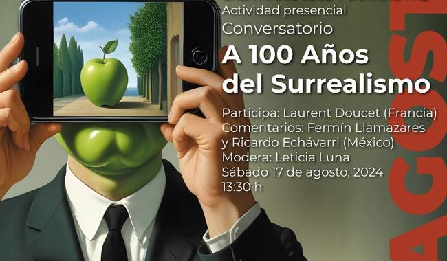 El conversatorio «A 100 años del surrealismo», con los especialistas Laurent Doucet (Francia), Fermín Llamazares y Ricardo Echávarri (México), se llevará a cabo el sábado 17 de agosto de 2024, a las 13:30 h, en la Casa Marie José y Octavio Paz (Felipe Carillo Puerto 445, colonia Tacuba, alcaldía Miguel Hidalgo, Ciudad de México). La entrada es gratuita.