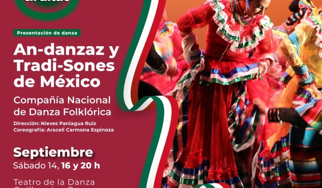 An-danzaz y Tradi-Sones de México es el título del programa que presentará la Compañía Nacional de Danza Folklórica, bajo la dirección de la maestra Nieves Paniagua y con coreografía de Araceli Carmona. El sábado 14 de septiembre, a las 16:00 y a las 19:00 h, la agrupación ofrecerá una mirada a la raíz de las danzas originarias mexicanas, junto con un muestrario de los sones más populares de México y su trascendencia a través del tiempo.