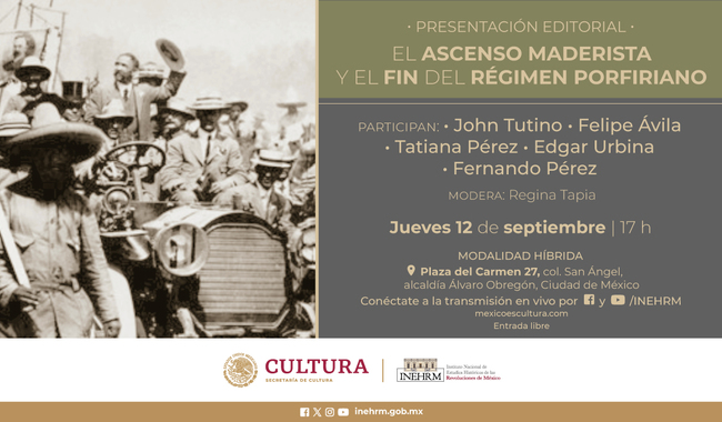 CDMX.- Para sumar un aporte original, por sus características, a la extensa bibliografía sobre el fin del porfiriato y el ascenso de Francisco I. Madero y su sueño democrático, el Instituto Nacional de Estudios Históricos de las Revoluciones de México (Inehrm), institución de la Secretaría de Cultura del Gobierno de México, invita a la presentación del libro El ascenso maderista y el fin del régimen porfiriano, de autoría colectiva.
