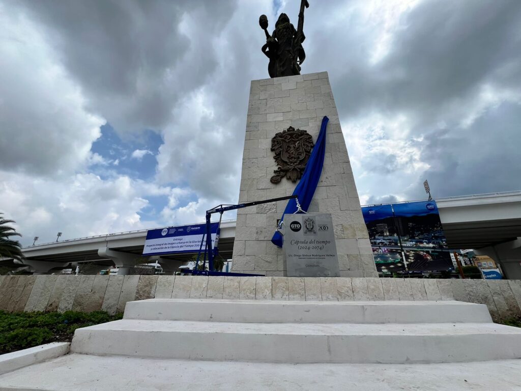 Guanajuato, Gto. Autoridades estatales y capitalinas, entregaron terminado el proyecto integral de imagen urbana en la glorieta Santa Fe y la colocación de una Cápsula del Tiempo por los 200 años de Guanajuato como estado libre y soberano, la cual será abierta en 50 años.