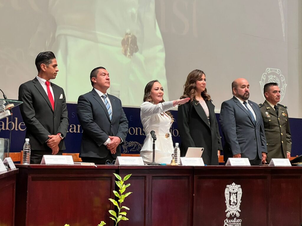 En la sesión solemne estuvo la gobernadora del estado, Libia García Muñoz Ledo, quien fue recibida de pie, con aplausos y reconocimiento de los asistentes integrados por todos los sectores de la sociedad guanajuatense.