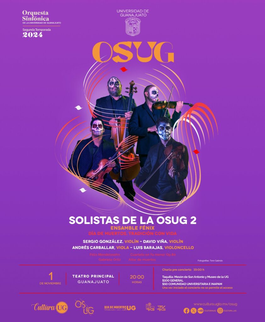 Guanajuato, Gto.- En el marco de la celebración del tradicional día de muertos ybajo el nombre “Programa día de muertos, tradición con la vida” se presentará el Ensamble Fénix, como parte de los Solistas de la Orquesta Sinfónica de la Universidad de Guanajuato (OSUG), este 01 de noviembre en el Teatro Principal en punto de las 20:00 horas.