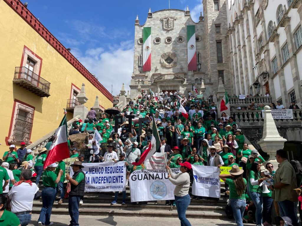 Guanajuato, Gto. Trabajadores del Poder Judicial del Estado y del Poder Judicial Federal, se manifestaron nuevamente en contra de la reforma judicial, la militarización del país y para pedirle a la presidenta de México, Claudia Sheinbaum Pardo, que participe en un nuevo diálogo.
