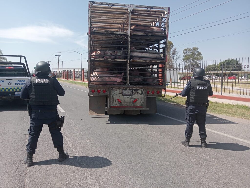 Celaya, Gto. Policías de las Fuerzas de Seguridad Pública del Estado (FSPE) recuperaron un tractocamión cargado con porcinos que iba escoltado por una camioneta de color negro tipo vagoneta.