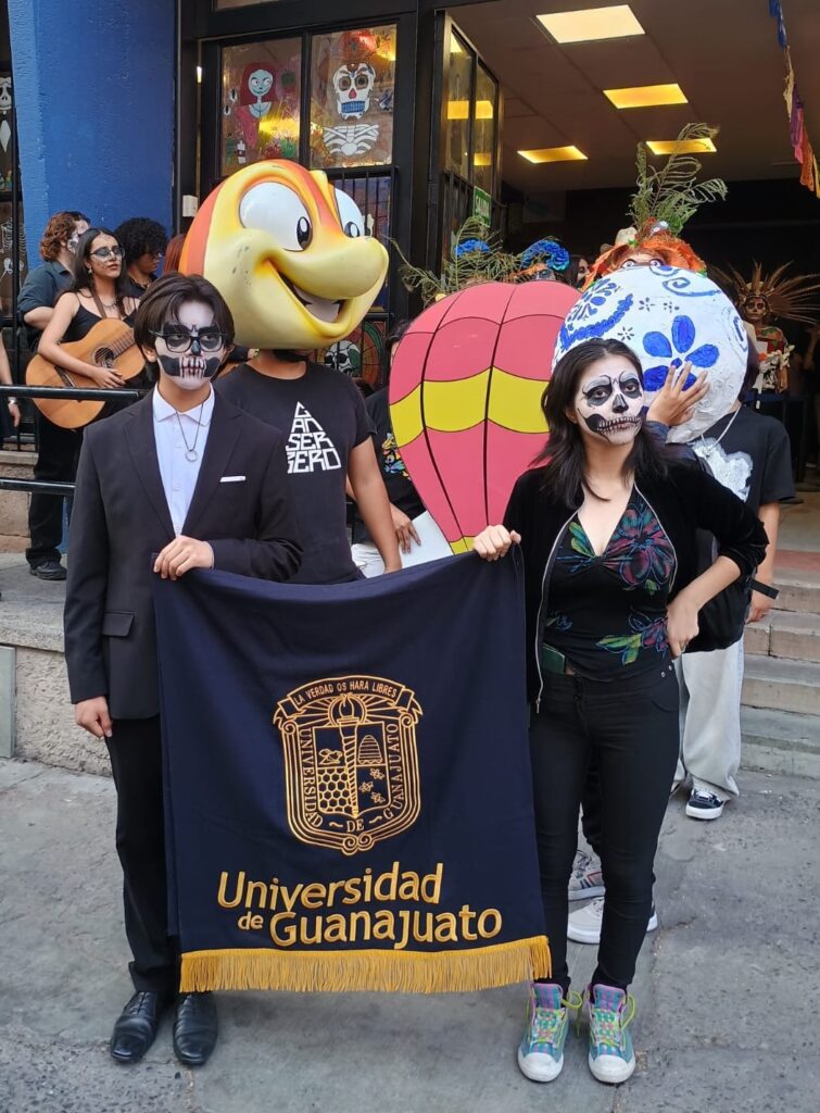 Por otra parte, en representación del equipo conformado por las y los jóvenes estudiantes: Regina Celaya, Natalia Alcántara, Braulio Jaramillo, Jorge López y Damián Guerra, la estudiante Luz Angelli Muñoz, caracterizada de “Catrina”, explicó que su atuendo fue inspirado en las, los activistas, así como periodistas que al levantar la voz fueron silenciadas y silenciados con la muerte.
