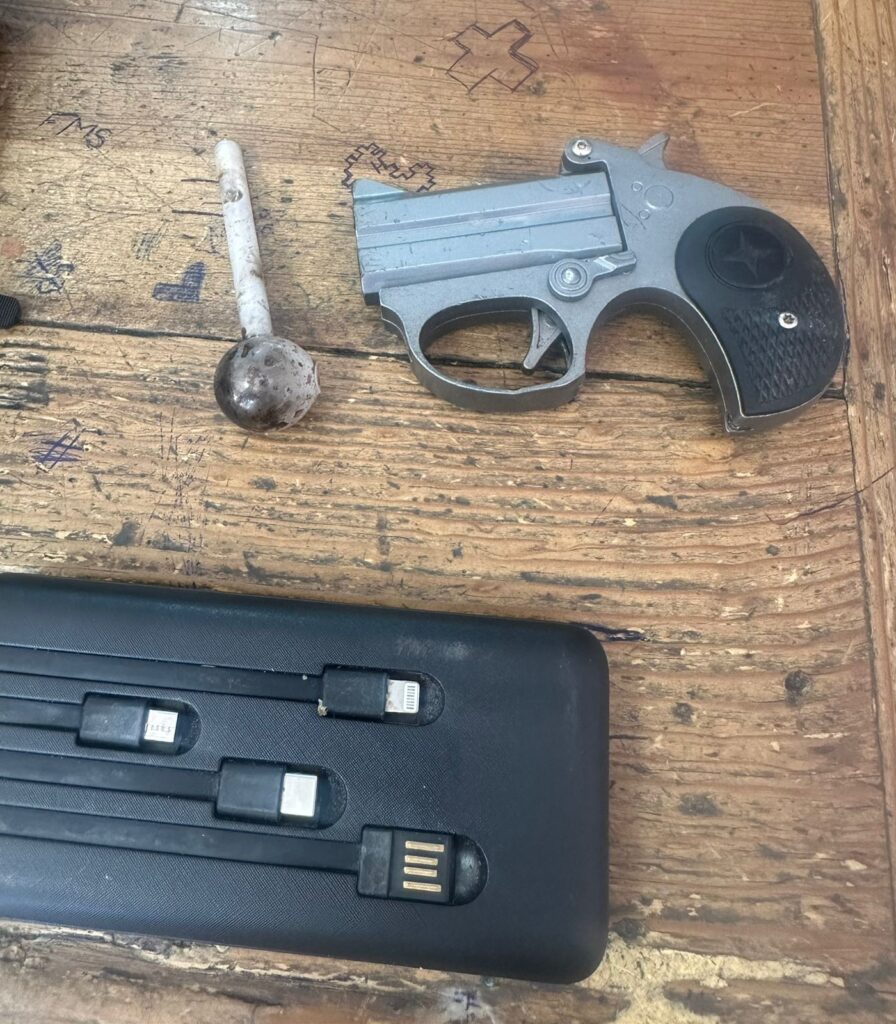 Para descartar riesgos se realizó una inspección preventiva y le encontraron entre sus pertenencias una arma de postas, así como una pipa con residuos de presunta droga cristal.