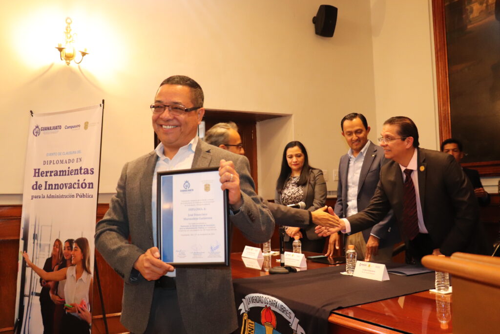 Con este diplomado, dijo, innovaron e inauguraron la instrucción en modalidad mixta pues combinaron sesiones virtuales con el acompañamiento de asesore(a)s especializados; diplomado que fue avalado y diseñado por la UG y que invita a reflexionar sobre la importancia del uso de integrar metodologías de innovación en la administración pública y explorar cómo dichas herramientas pueden ser catalizadoras del cambio en las instituciones, “sin duda refuerza el compromiso con la mejora continua en favor de la sociedad”