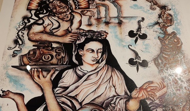 Igualmente, destaca El abrazo, que representa la parte instintiva del ser humano, el deseo, el placer y la crítica social hacia lo que se considera “pecado”, como parte de un universo simbólico que refleja una profunda conexión con el arte del México antiguo, en una fusión libre con estéticas y tradiciones diversas como la tibetana, china y occidental, lo que da lugar a un estilo único donde dialogan lo ancestral y lo contemporáneo.
