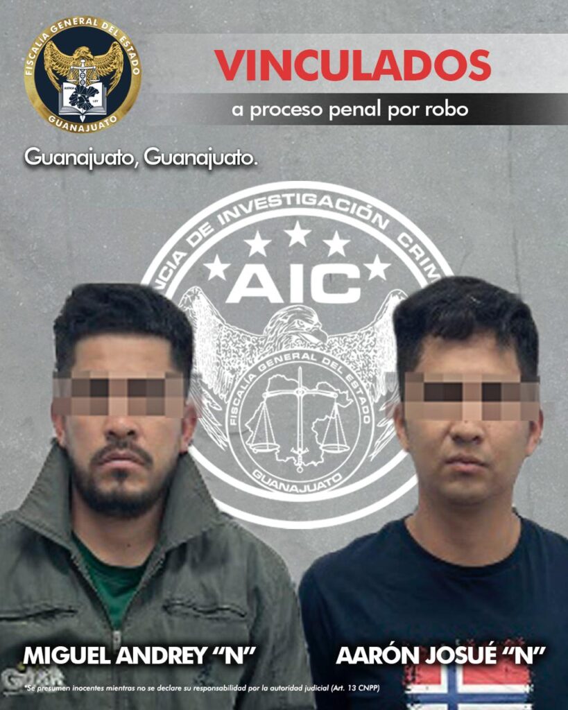 Guanajuato, Gto. Dos jóvenes identificados como MIGUEL ANDREY “N” y AARÓN JOSUÉ “N” fueron enviados a prisión, vinculados a proceso penal por su presunta participación en el robo de un vehículo, ocurrido en el municipio de Guanajuato.
