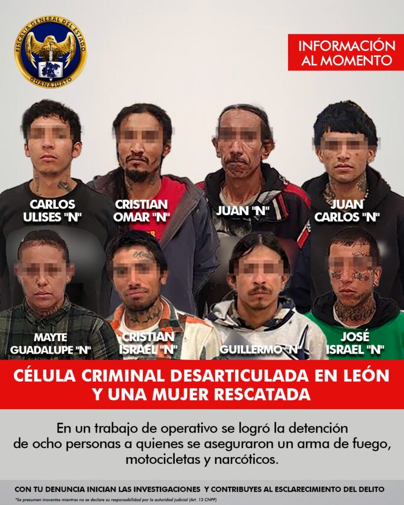 la desarticulación de una célula criminal en León, relacionada con delitos como privación de la libertad, posesión de narcóticos y robo de vehículos. En el operativo, realizado en la colonia Lomas del Mirador, al sur de la ciudad, se rescató a una mujer que había sido privada de su libertad.