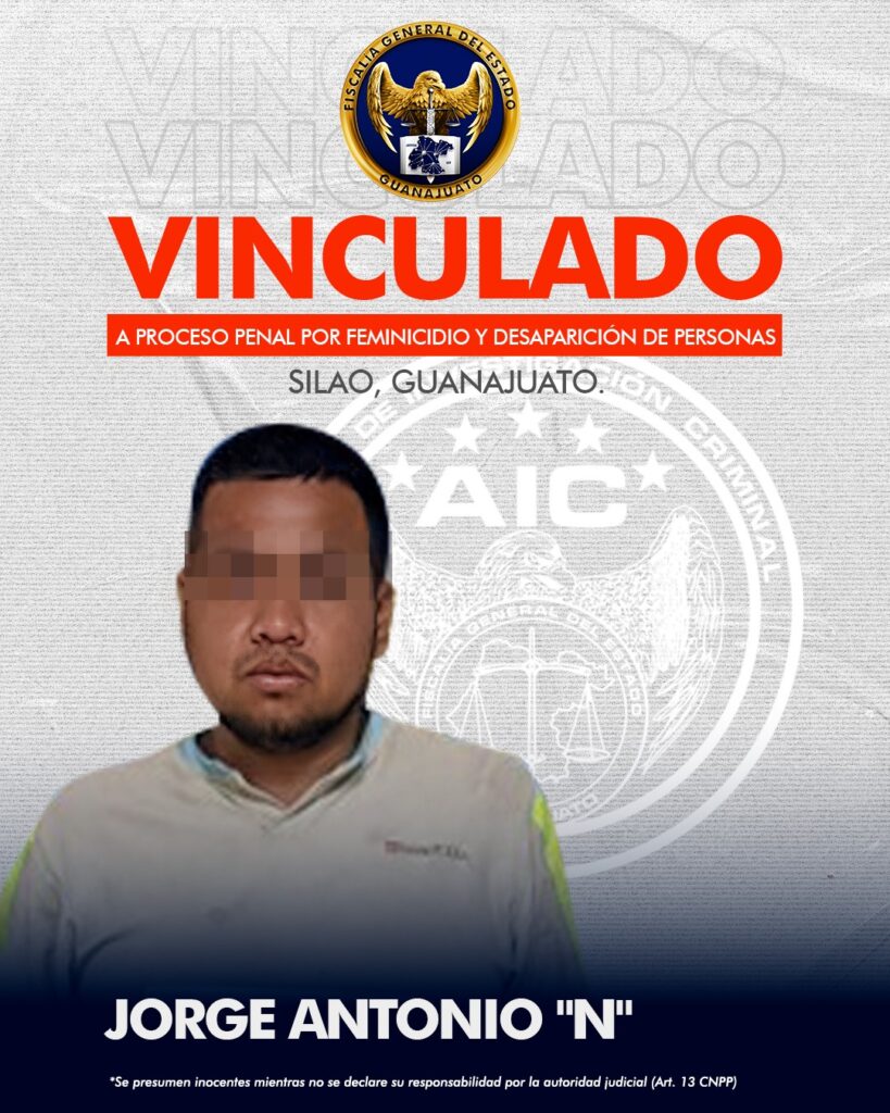 Silao, Gto. La Fiscalía de Guanajuato logró que JORGE ANTONIO “N”, fuera vinculado a proceso penal por su presunta participación en los delitos de feminicidio y desaparición de personas cometidos el 22 de diciembre de 2024 en Silao.