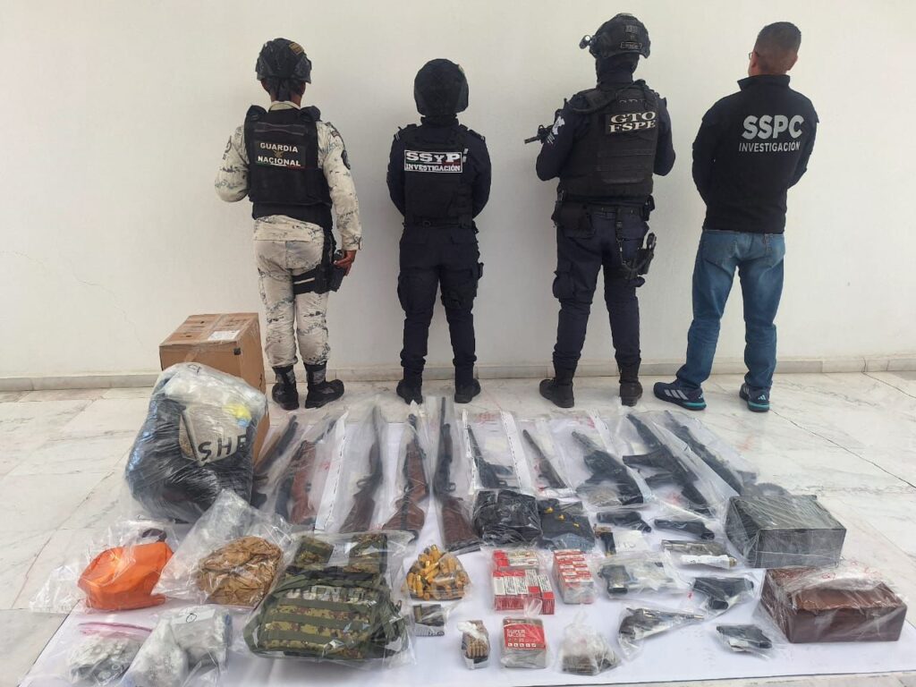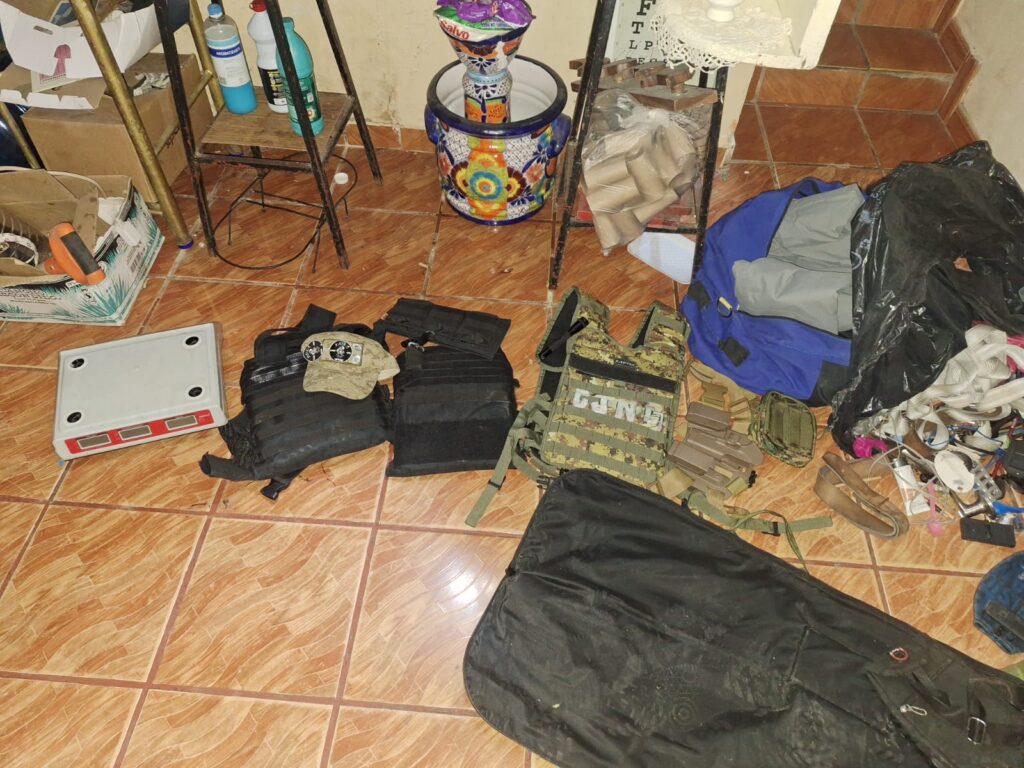 En estos domicilios se aseguraron nueve armas largas, seis armas cortas, cartuchos y cargadores de diversos calibres, así como equipo táctico consistente en chalecos y una gorra con leyendas de un grupo delictivo. También fueron asegurados envoltorios que contenían sustancias con apariencia de cannabis sativa y clorhidrato de metanfetamina.