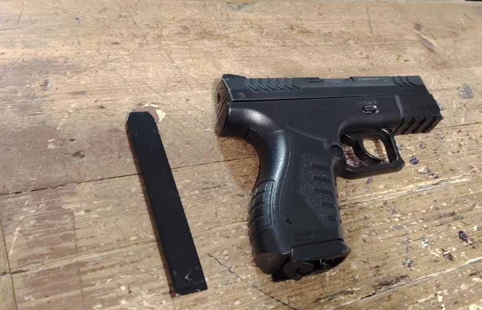 Al llegar al lugar e informar el motivo de la presencia policial el grupo de jóvenes, entre hombres y mujeres, comenzaron a lanzar insultos y como medida de prevención se realizó una inspección encontrando entre la ropa de uno de ellos el arma de balines.