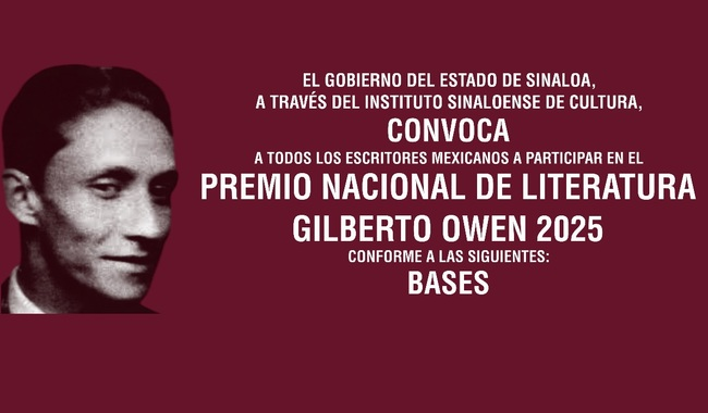 Culiacán, Sin.- Con premios en efectivo por 125 mil pesos en cada género, el Gobierno del Estado de Sinaloa, a través del Instituto Sinaloense de Cultura (ISC), lanzó la convocatoria para participar en el certamen del Premio Nacional de Literatura Gilberto Owen 2025, en poesía y cuento.