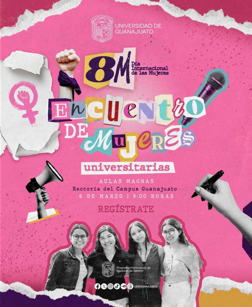 Guanajuato, Gto.- Este jueves 6 de marzo, se realizará el “Encuentro de Mujeres Universitarias” en la Universidad de Guanajuato (UG), organizado por el Programa Institucional de Igualdad de Género (PIIG) en colaboración con la Dirección de Desarrollo Estudiantil. Este evento, enmarcado en la Agenda #8M del Día Internacional de las Mujeres, convoca a la comunidad universitaria a generar espacios de diálogo e intercambio entre integrantes de los diversos campus y divisiones de la UG.